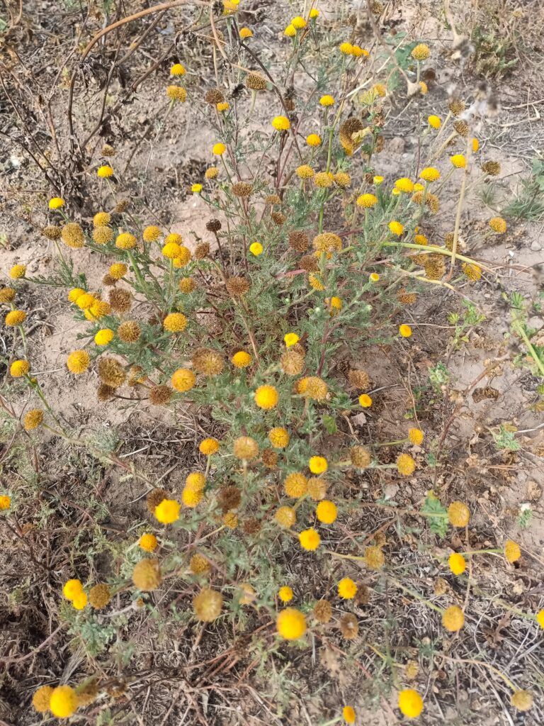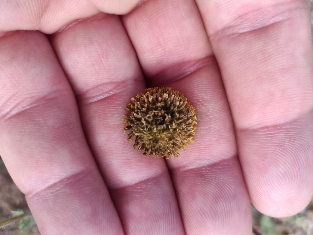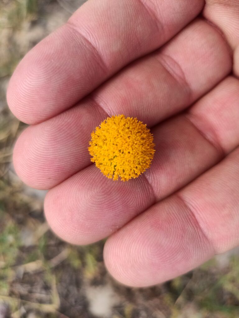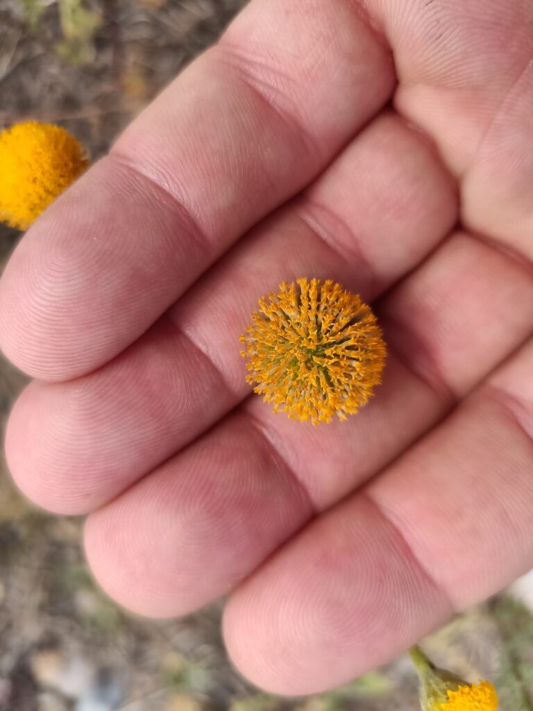 Entre marzo y mayo sus flores, tubulares de unos 5mm amarillentas y carentes de lígulas (en caso de existir, son muy escasas) forman discos en capítulos solitarios de unos 2,5cm de diámetro.