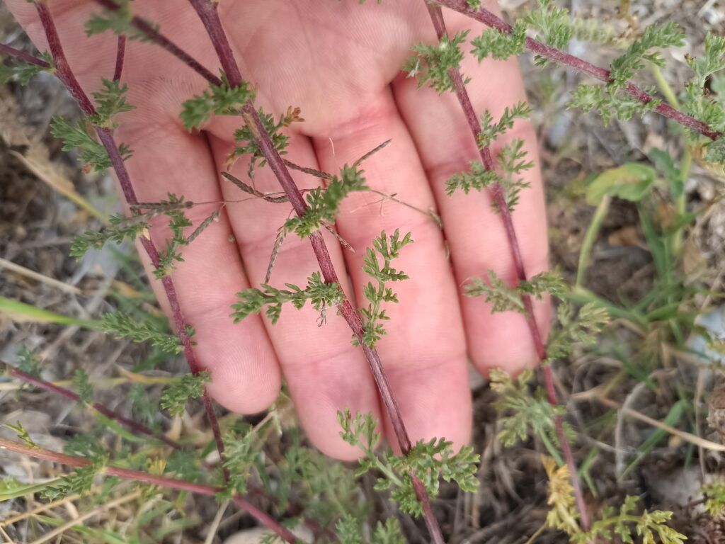 Sus hojas, de un verde claro a veces grisáceo, son profundamente divididas en segmentos lineares.