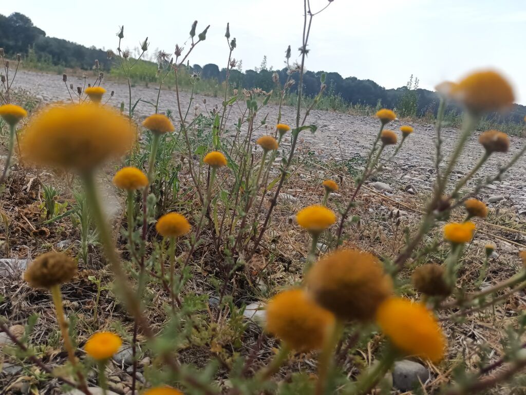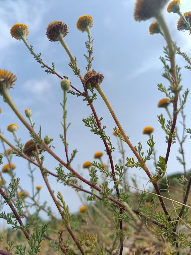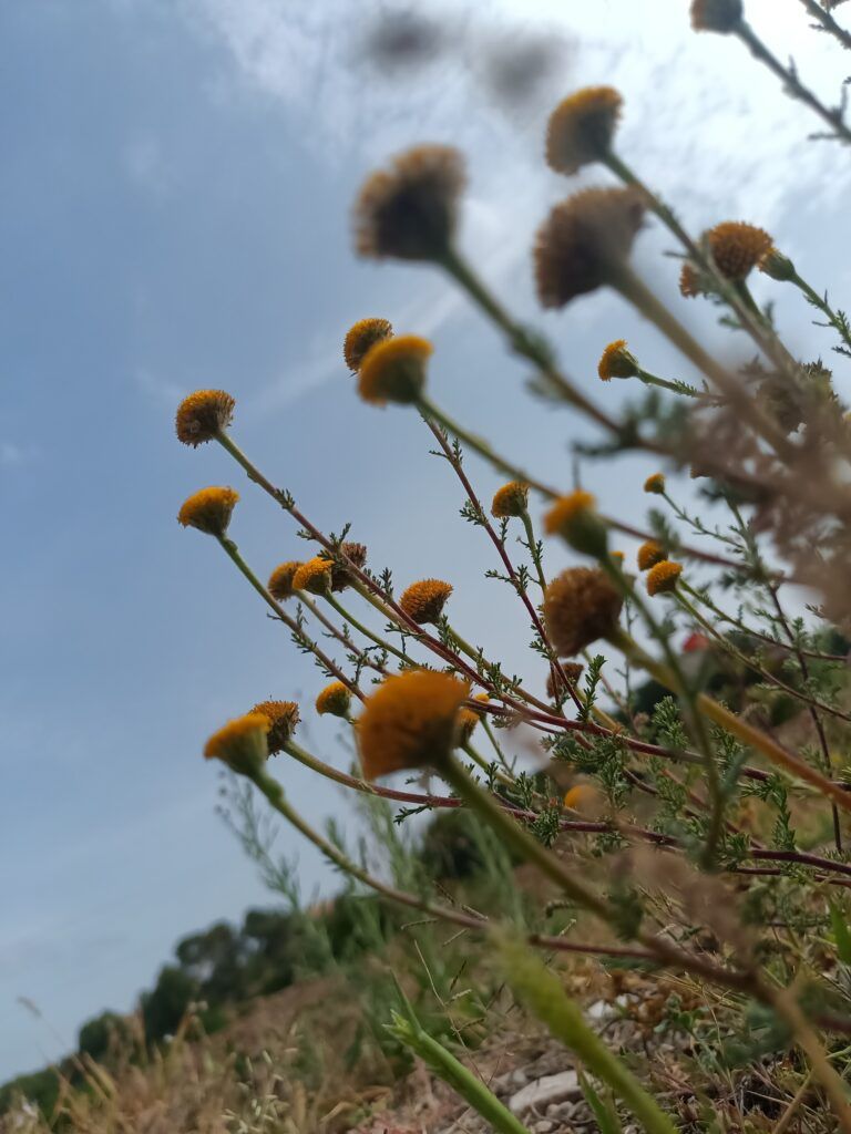 A uno y otro lado del camino, entre pequeñas hojas glaucas, surgen los botones amarillos de la magarza valenciana o manzanilla silvestre.