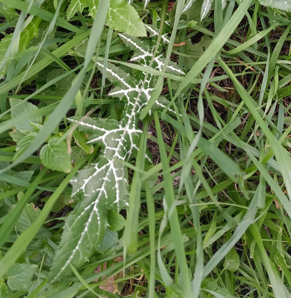 Las hojas basales se disponen en roseta, son grandes (de 30 a 50cm), lisas, simples, más anchas en inicio que en la fase terminal, de márgenes aserrados y peciolo corto. Las hojas superiores (caulinares) son de menor tamaño, alternas, profundamente divididas con lóbulos foliares muy marcados y finas espinas; son de color verde intenso recorridas por líneas blanquecinas y envés tormentoso.