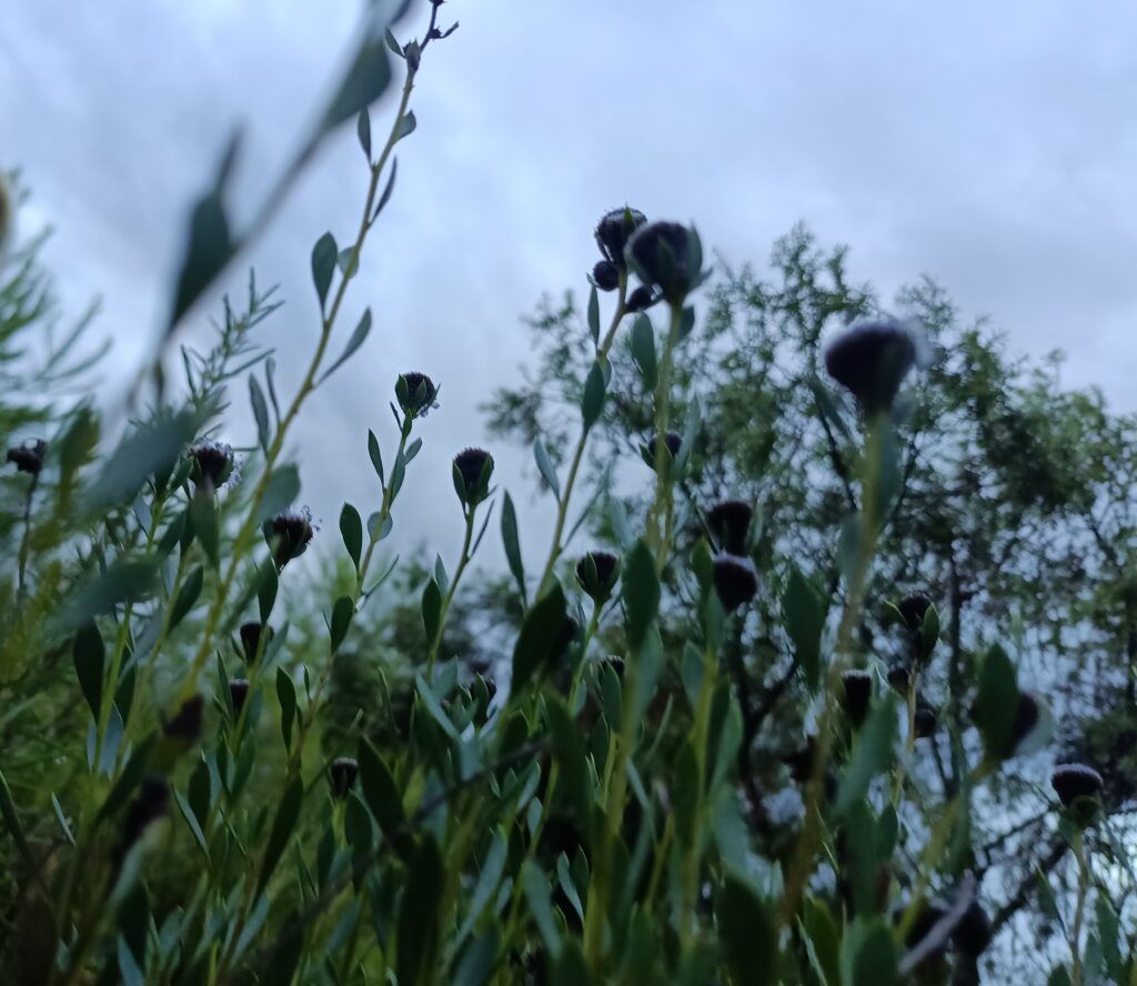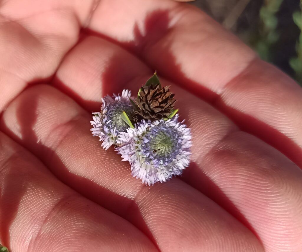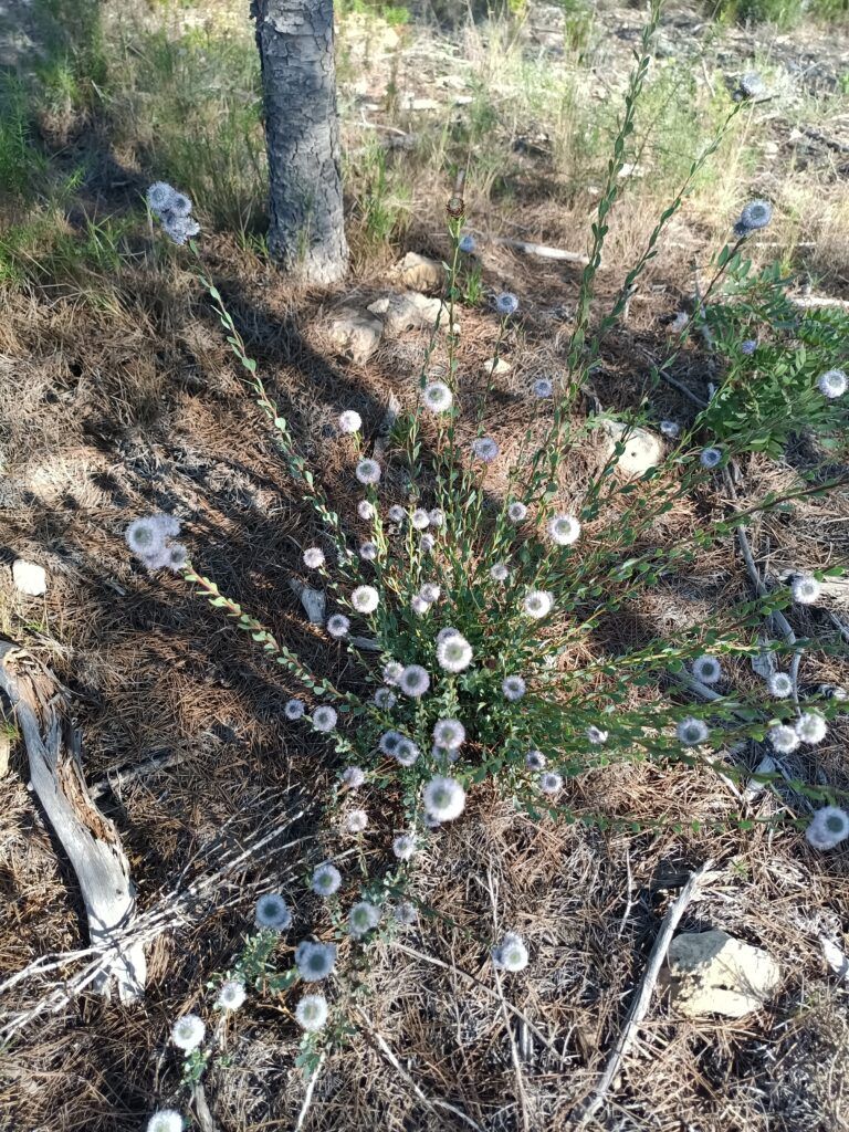 Al pie de coscojares, entre tomillos y romeros, densas matas con tallos leñosos laureados de verde gris, terminan en las testas de monjes entre azul y morado de la corona de fraile o seullà.