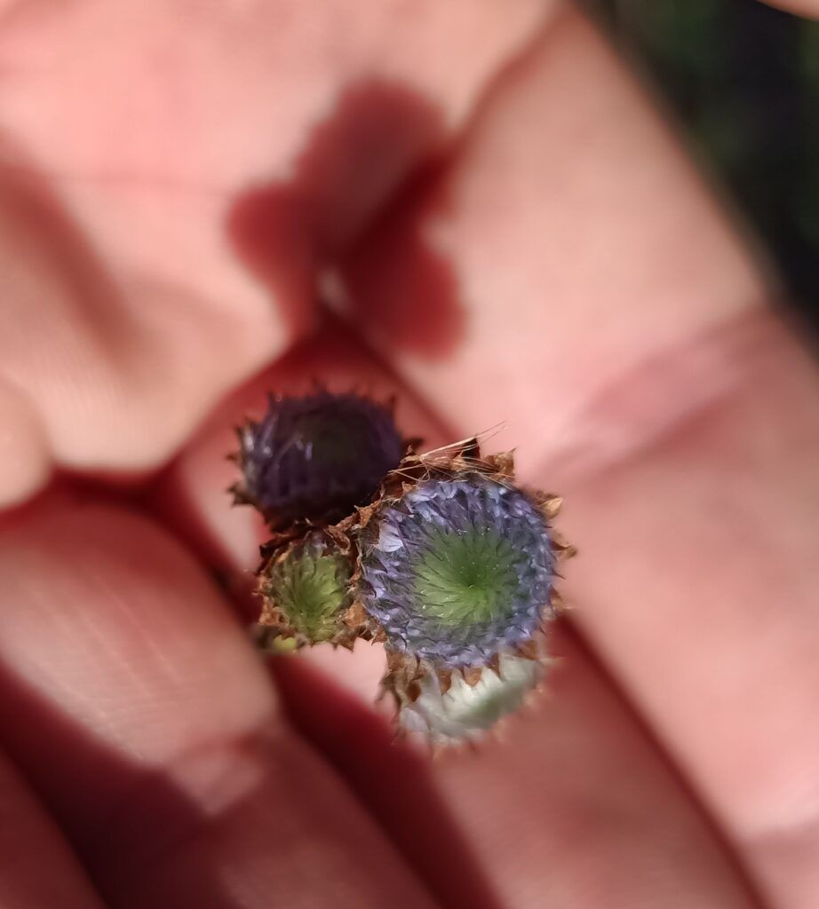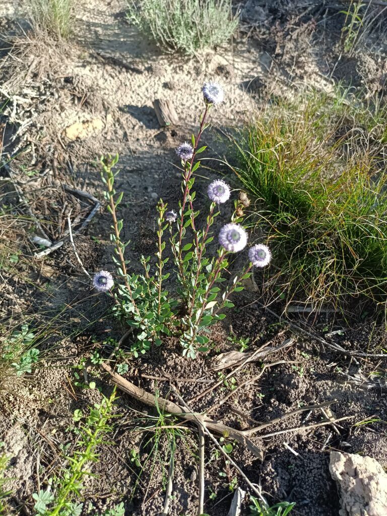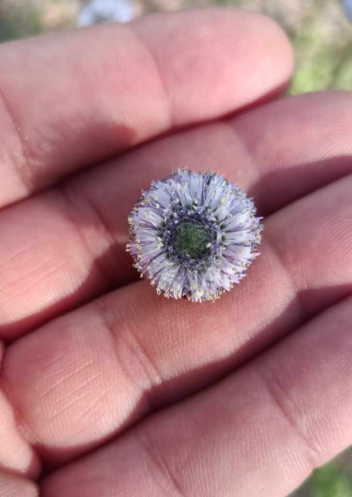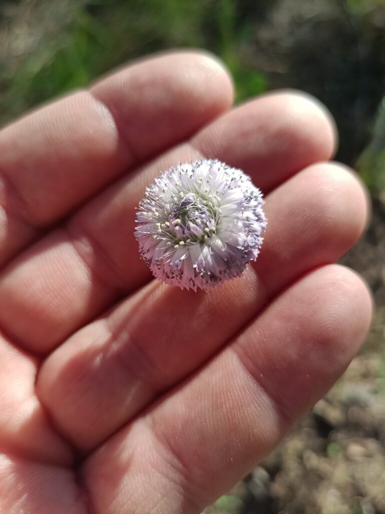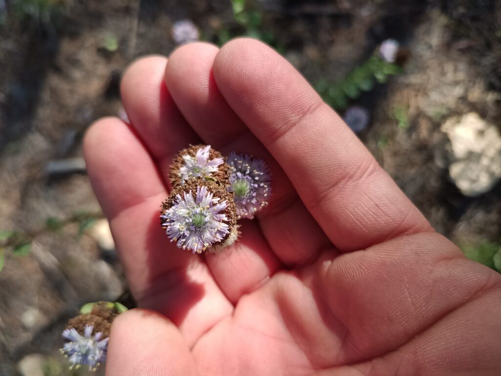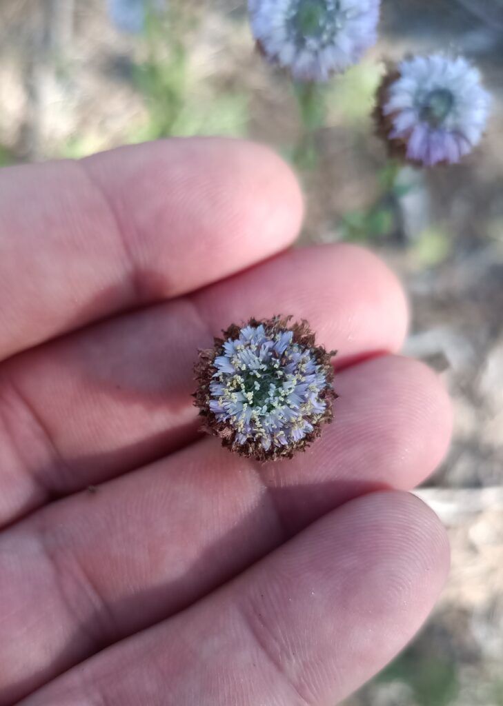 Florece en abril y otra vez con las primeras lluvias de otoño. Sus inflorescencias, pequeños capítulos globosos de un azul pálido, aparecen en la parte terminal de los tallos.